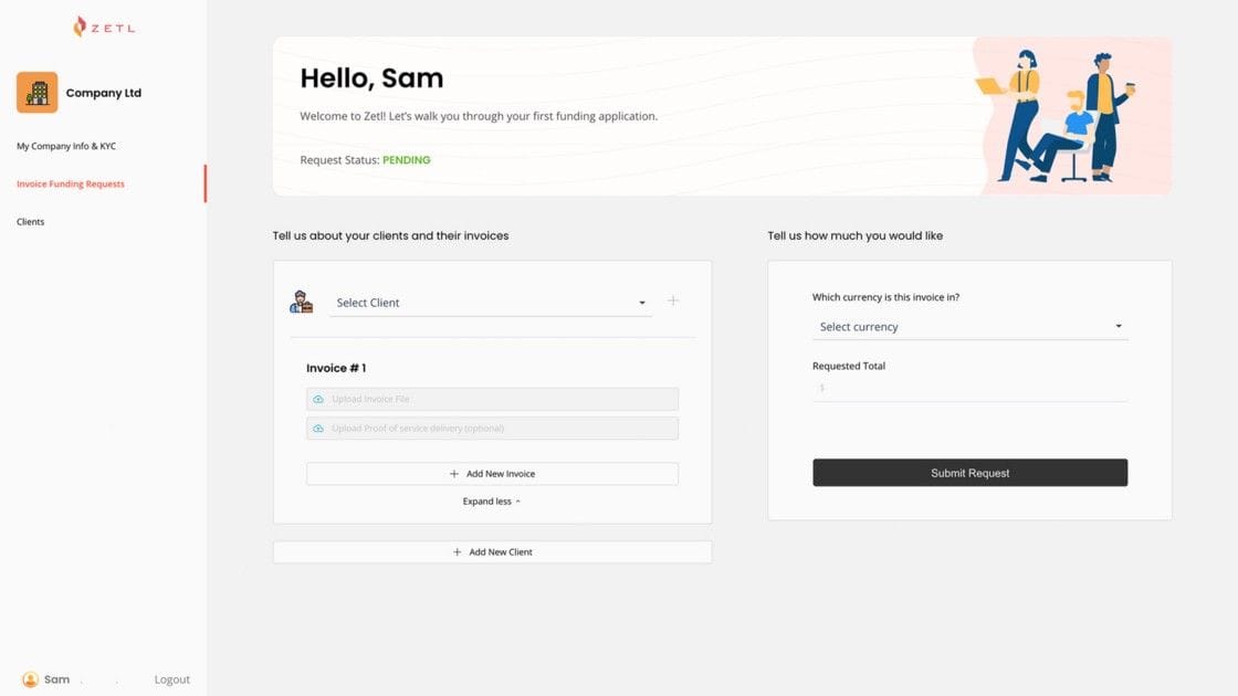 In the second step, we require you to submit the invoice for which you would like to receive funding. If this is your first invoice from a new client, we require some basic information from the client as well.